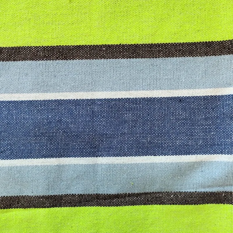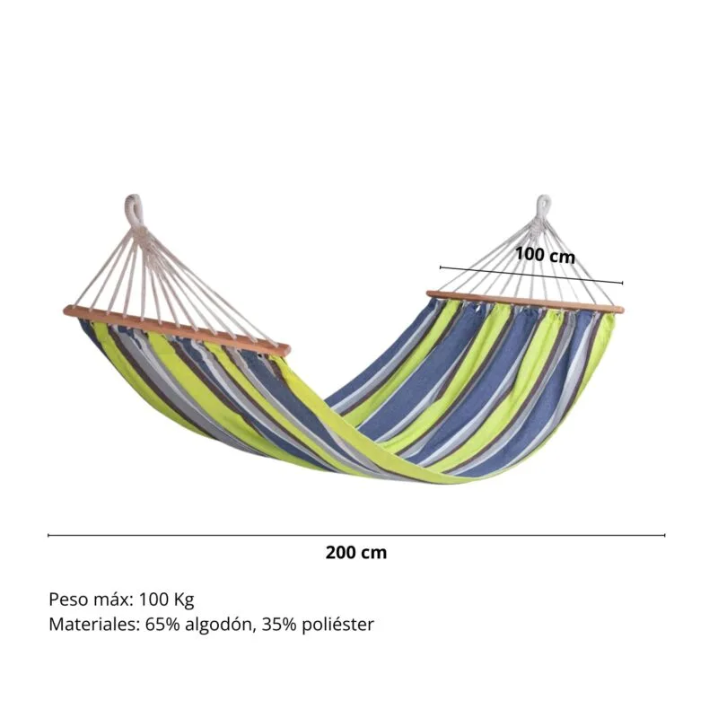 La hamaca Río está fabricada con 65% algodón y 35% poliéster. Mide 200 cm de largo por 100 cm de ancho. Es capaz de soportar hasta 100 Kg de peso. Cuenta con una vara transversal de madera para mayor estabilidad.