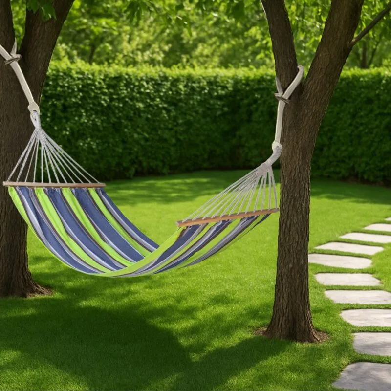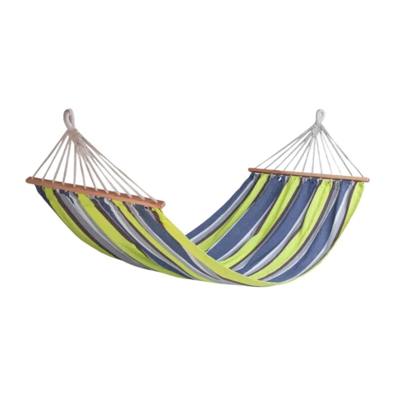 Hamaca Río, inspirada en el estilo y ambiente de Río de Janeiro con una combinación de tonos verdes, azules y morados. Puedes colocarla en tu jardín, terraza o patio para conseguir un descanso al aire libre. Es cómoda y estable gracias a su varilla transversal de madera. Te aseguramos que una vez la pruebes, no querrás levantarte. Viene con un kit de sujeción y una funda para su fácil almacenaje.