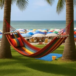 Nuestras hamacas están pensadas para adaptarse a cualquier espacio exterior: desde grandes jardines hasta terrazas o patios pequeños. Si buscas una opción resistente y duradera, tienes modelos en tela y madera, ideales para soportar el uso diario y el clima. Si prefieres algo más decorativo, también puedes encontrar hamacas de colores vivos o tonos neutros que encajan en cualquier ambiente.