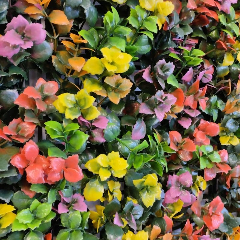 El jardín vertical artificial Mix Colour es uno de nuestros jardines más colorido. Mezcla tonalidades rojizas, rosas, naranjas y verdes.