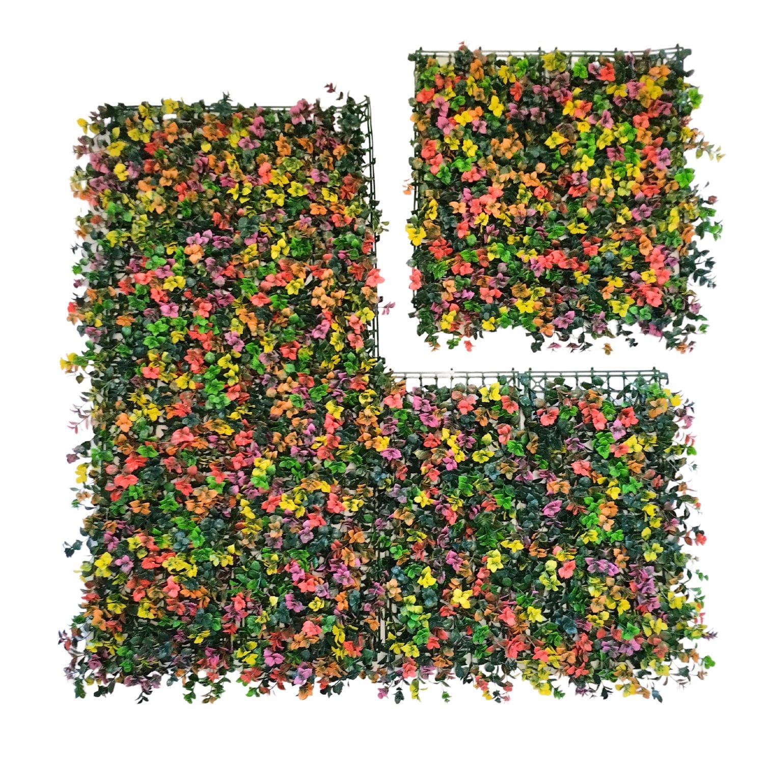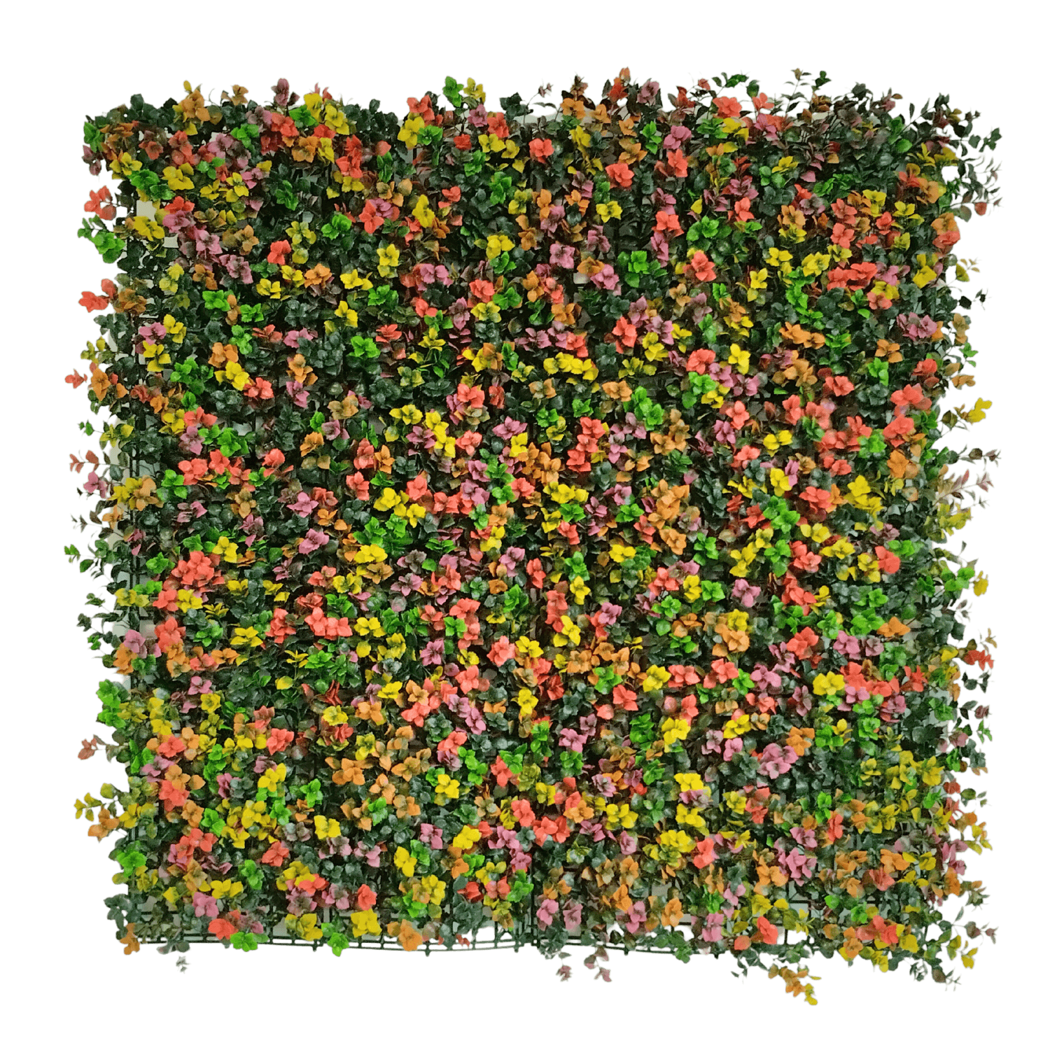 El jardín vertical artificial Mix Colour es perfecto para darle mucho color a tus espacios. Cuenta con flores en color verde, naranja, amarillo, rosa y rojo. Es apto tanto para exterior como para interior porque tiene un tratamiento ultravioleta. Conseguirás un resultado natural, colorido y muy original. Además, no necesita mantenimiento por lo que podrás disfrutar sin ninguna preocupación. Solo tendrás que retirar el polvo que se acumule con un paño húmedo, un plumero o directamente con la manguera.