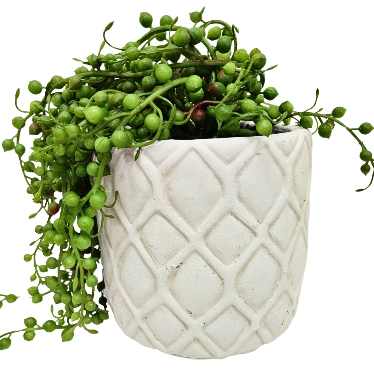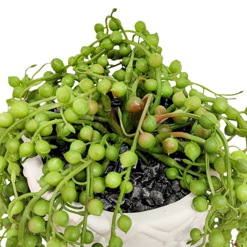 Mini Senecio artificial de 15 cm de altura en maceta de cemento de color blanco roto. También conocida como planta del rosario por su hojas con forma redonda que cuelgan de sus tallos alargados. No requiere mantenimiento y es perfecta para decorar estancias interiores.